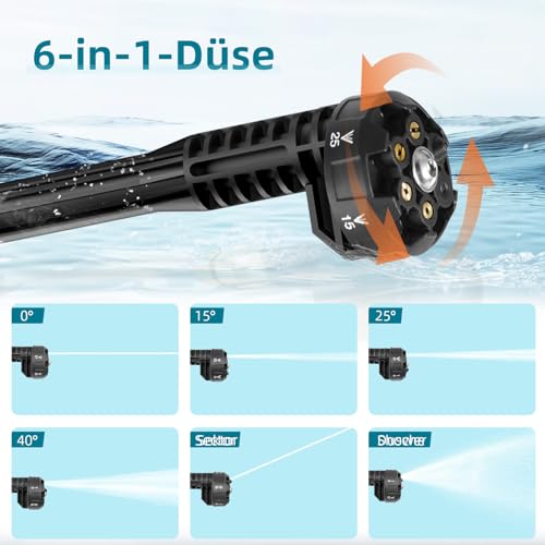 - 【Six-in-One Nozzle】The cordless high pressure washer is equipped with a six-in-one nozzle, which can be used in 0°, 15°, 25°, 40°, 0° shower and spray modes. The water pressure can be adjusted according to the situation and location of the stains. The soap bottle included with the jet washers/pressure washers makes it easier to remove stubborn stains and hard-to-reach corners. Meet all outdoor cleaning needs.
