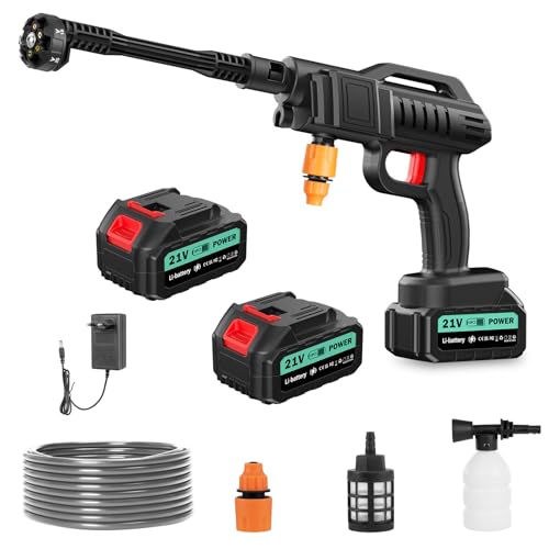 - 【Complete Set】The portable battery pressure washer contains a full set of accessories, which is powerful and versatile. Package Included: 1x Portable High Pressure Washer gun, 1x 21V Charger, 2 x 3.0 Ah Batteries, 1x Quick Connector, 1x Coke Connector, 1x 16cm Short Pipe, 1x 5m Water Pipe, 1x Filter, 1x Switch Raft, 1x Foam Bottle, 1x 6-in-1 Spray Head.