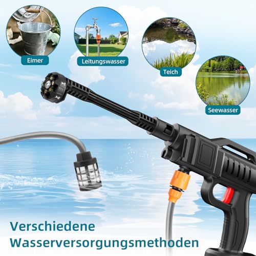 - 【Wide Application】: The cordless pressure washer can easily draw water from bottles, buckets, ponds, streams or any water source, saving a lot of water and working time. The Cordless Pressure Washer is equipped with a 16.4-foot hose, which means you can carry it with you without connecting to the faucet. The pressure washer is suitable for washing cars, electric cars, bicycles, fences, terraces, gardens, yards, outdoor furniture, etc.