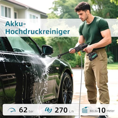 - 【62Bar/899PSI Portable Pressure Washer】The Cordless Pressure Washer has a maximum working pressure of 62Bar/899PSI, a range of up to 10 meters, and a water spray speed of up to 270 liters/hour, which is suitable for flexible use over large areas and can quickly remove stubborn stains. The battery pressure washer is suitable for washing cars, driveways, walls, floors, swimming pools, windows, and pet showers.