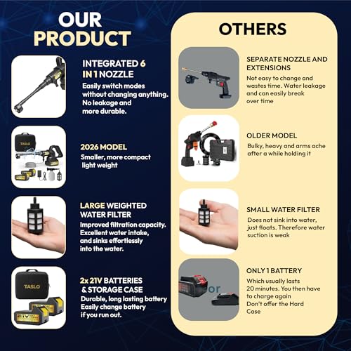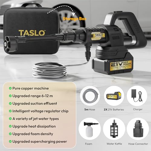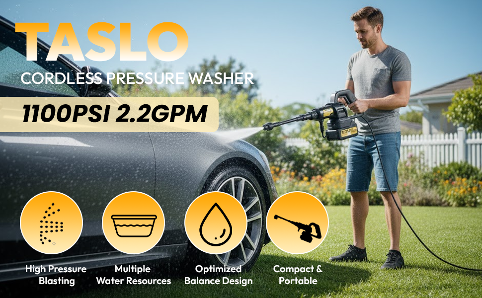 [2026 Design] The Taslo Cordless Pressure Washer is the latest 2026 design. It is more compact, lightweight, easier to handle and easier to put away after use.
