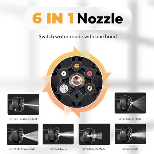 [6 in 1 Cordless Pressure Washer] – With a turn of the nozzle you can easily switch between 6 different modes that suit the task. For example, you can change to the nozzle which has a degree of 0°, 15°, 25°, 40, or shower mode or heavy foam mode.