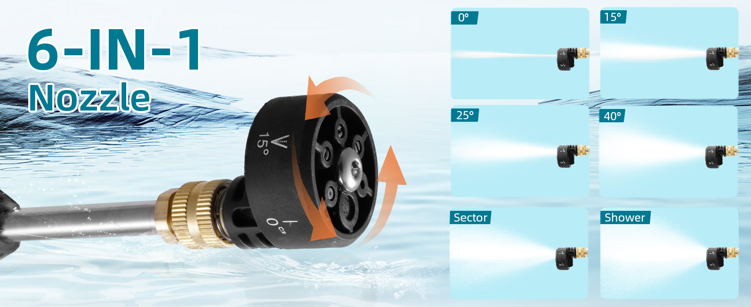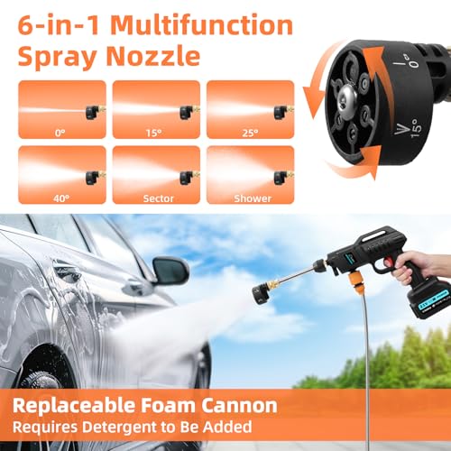 ✨【Versatile 6-in-1 Spray Nozzle for Total Cleaning Control]】Our WZTO portable cordless power washer features a convenient 6-in-1 spray nozzle, allowing you to easily switch between six different spray modes with a simple twist. Choose from 0°, 15°, 25°, and 40° angles, as well as foam and mist modes, to tackle any cleaning job. Whether you're blasting dirt from hard surfaces or gently rinsing delicate plants, the flexible nozzle gives you total control over the intensity and coverage, making every task quicker and more efficient.