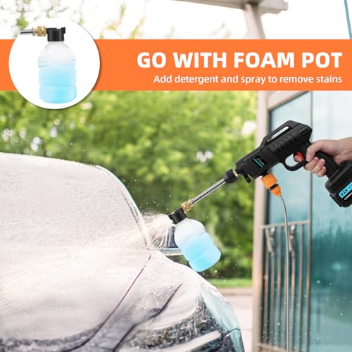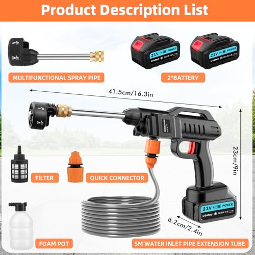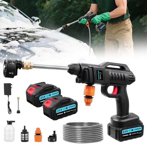 【Complete Kit 】The portable cordless pressure washer kit come with 1x Battery Pressure Washer, 1 x Extension Rod, 1x 21V Fast Charger, 2x 3000mAh Batteries, 1x Quick Connector, 1x 16.4ft Hose, 1x Water Filter, 1x Foam Bottle, 1x Switch Raft, 1x 6-IN-1 Nozzle, 1x User Manual, providing you with everything you need for a thorough car wash.