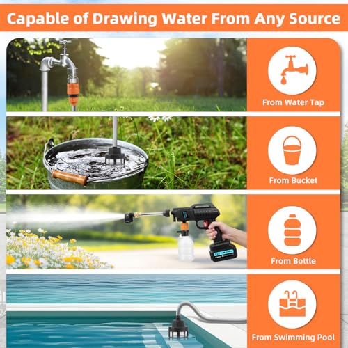【Draws Water from Anywhere】This Portable Battery-Powered Pressure Washer draws water from any source, giving you the flexibility to clean anywhere there is water. Whether you're using a bucket, lake, or pool, this portable power washer allows you to clean effortlessly and efficiently. Its cordless design further enhances its portability, making it the perfect tool for all your outdoor cleaning needs.