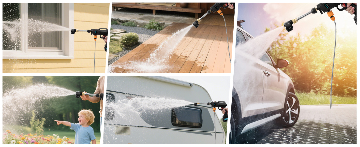 【Multi-purpose and Wide Range】The hand held power washer is ideal for watering plants, cleaning walls, floors, bathrooms, swimming pools, doors, driveways, fences, and hard-to-clean corners in your home and garden. Manual. It can also be used to wash various types of cars, bicycles, motorcycles, etc. The cordless design allows you to use it anywhere, from the deck of a cruise ship to RV camping.