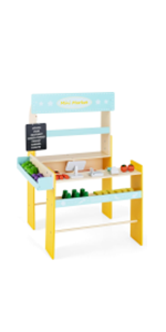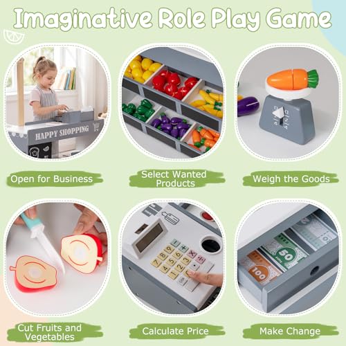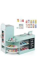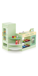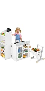 - 【Ample Storage & Display Shelves】Featuring front display layers and side storage shelves, the supermarket playset for kids helps keep accessories neatly organized. Additionally, 2 blackboards offer a creative space for children to write, draw, or display special offers.