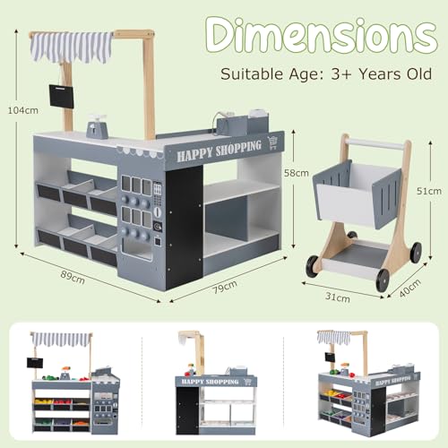 COSTWAY Pretend Play Shop, Kids Supermarket Playset with Shopping Cart, Canopy, Blackboard & Accessories, Wooden Role Play Grocery Store for Ages 3+ (Grey)