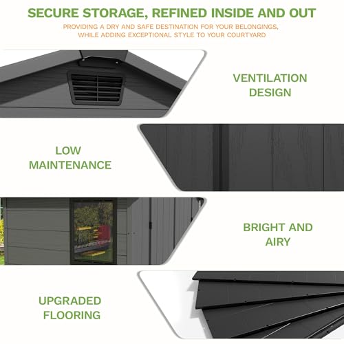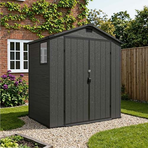 - All-Weather Protection Built for the UK Climate:Engineered to withstand British weather. Constructed from high-density, UV-resistant resin, it is fully waterproof, rust-proof, and fade-free. The apex roof efficiently sheds rainwater, while integrated ventilation prevents condensation and mildew, ensuring your belongings stay dry and fresh.