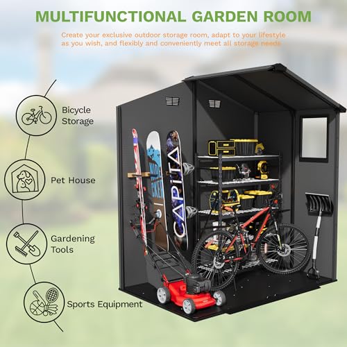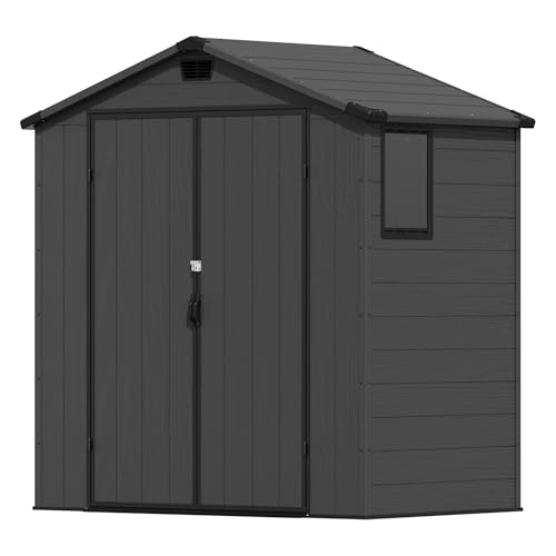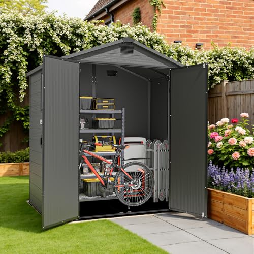 Devoko 6x4ft Outdoor Plastic Garden Storage Shed with Lockable Double Doors & Apex Roof – Patio Backyard Tool Shed, Bike Shelter, Garbage Bin Store – Weather and Fade Resistant – Dark Gray
