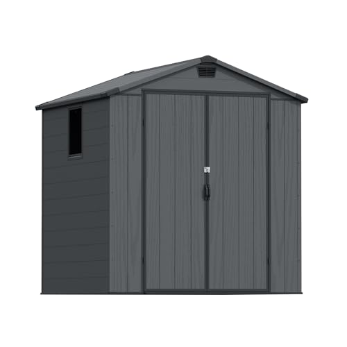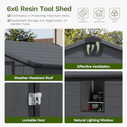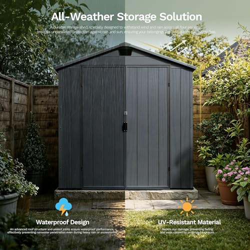 Devoko 6x6ft Outdoor Plastic Garden Storage Shed with Lockable Double Doors & Apex Roof – Patio Backyard Tool Shed, Bike Shelter, Garbage Bin Store – Weather and Fade Resistant – Dark Gray