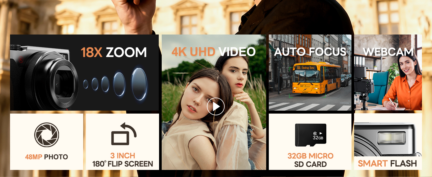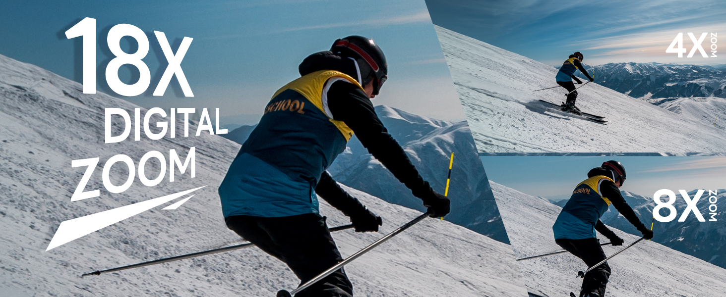 · 【4K Autofocus Cameras for Photography】This digital camera has an autofocus function. In photography mode, gently press the capture button to keep the camera stable. The camera will automatically focus on this point, and a green box will appear to indicate successful focusing,making it easy for both beginners and kids. In addition, the digital camera supports 18x digital zoom, allowing you to easily capture distant objects.