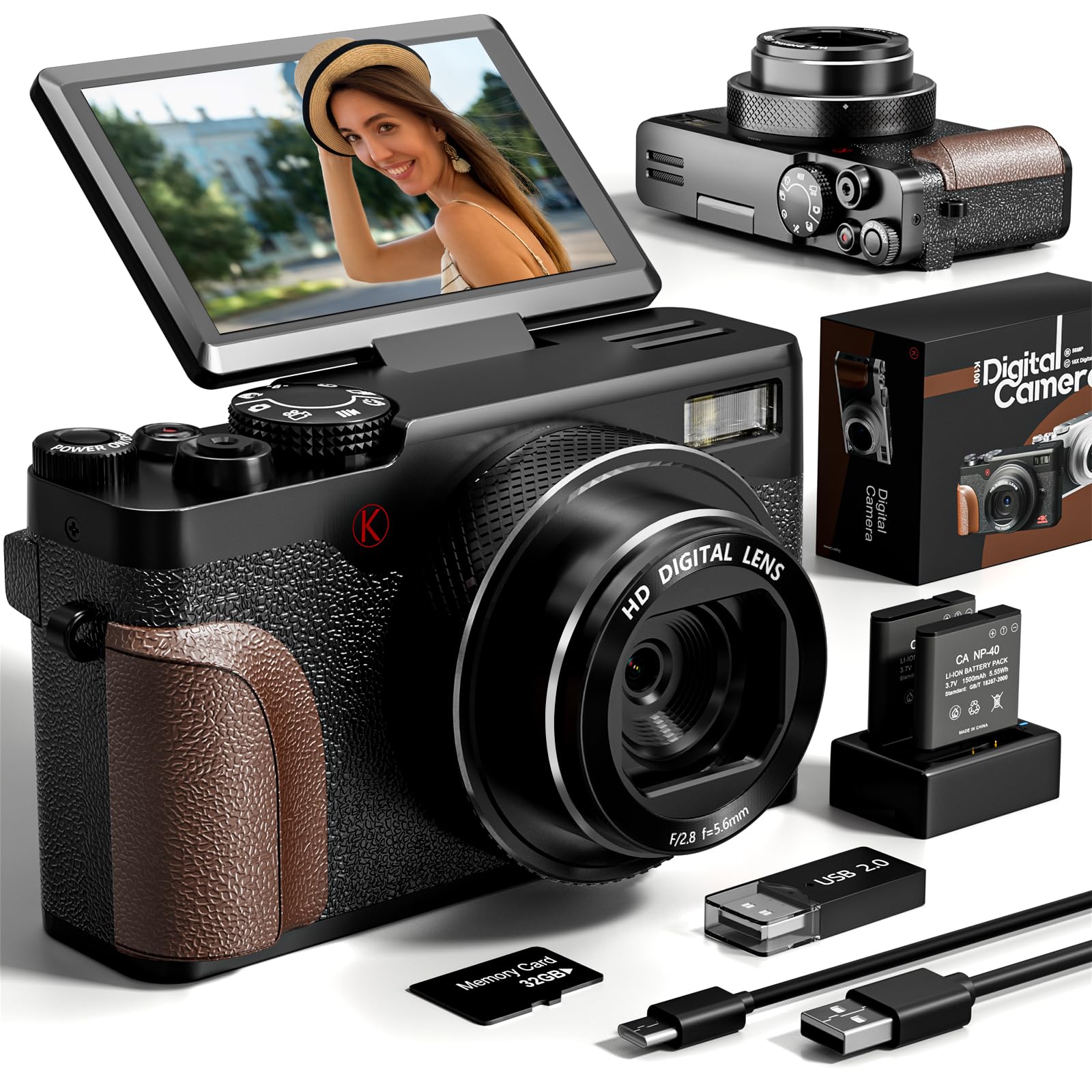 Digital Camera, 48MP Cameras for Photography, 4K Vlogging Camera for YouTube, 180°Flip Screen Digital Point and Shoot Camera with 18X Zoom, Compact Camera for Beginner with 32GB Card(2 Batteries)