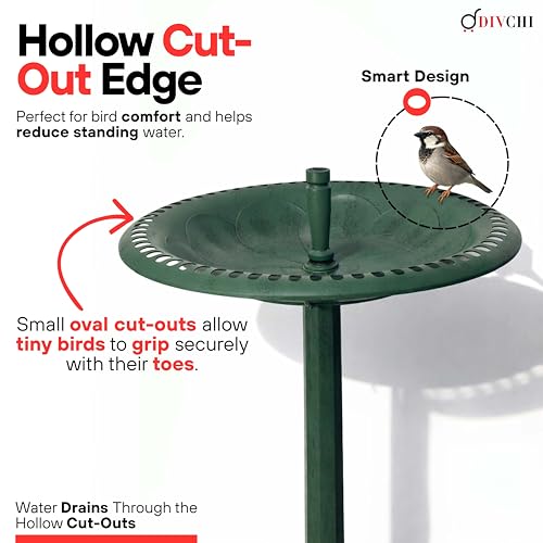 LARGE TOP BOWL FOR BATHING OR FEEDING: The generously sized top bowl is perfect as a bird bath or bird feeding station. Holds ample water or bird food, encouraging wild birds to drink, bathe and feed comfortably. Oval rim cut-outs allow easy perching for small birds.