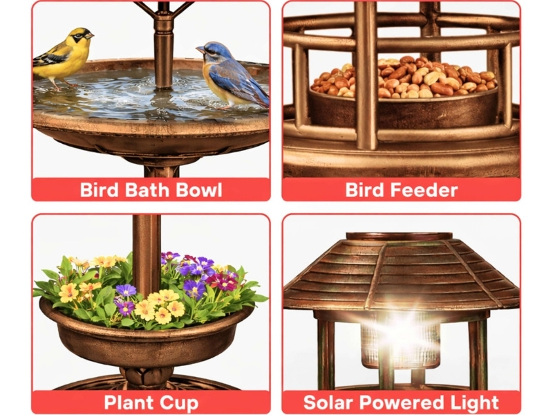 - 3-IN-1 BIRD BATH, FEEDER & PLANTER – This multifunctional garden feature includes a wide bird bath bowl, a feeding platform, and a lower planter section—perfect for adding flowers or plants to brighten your outdoor space. Weatherproof, Lightweight Freestanding Birds Feeder.