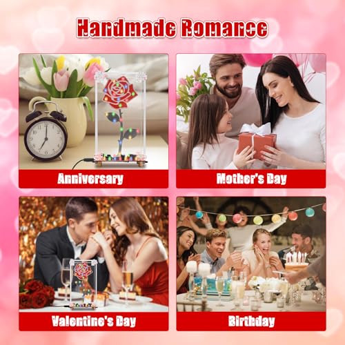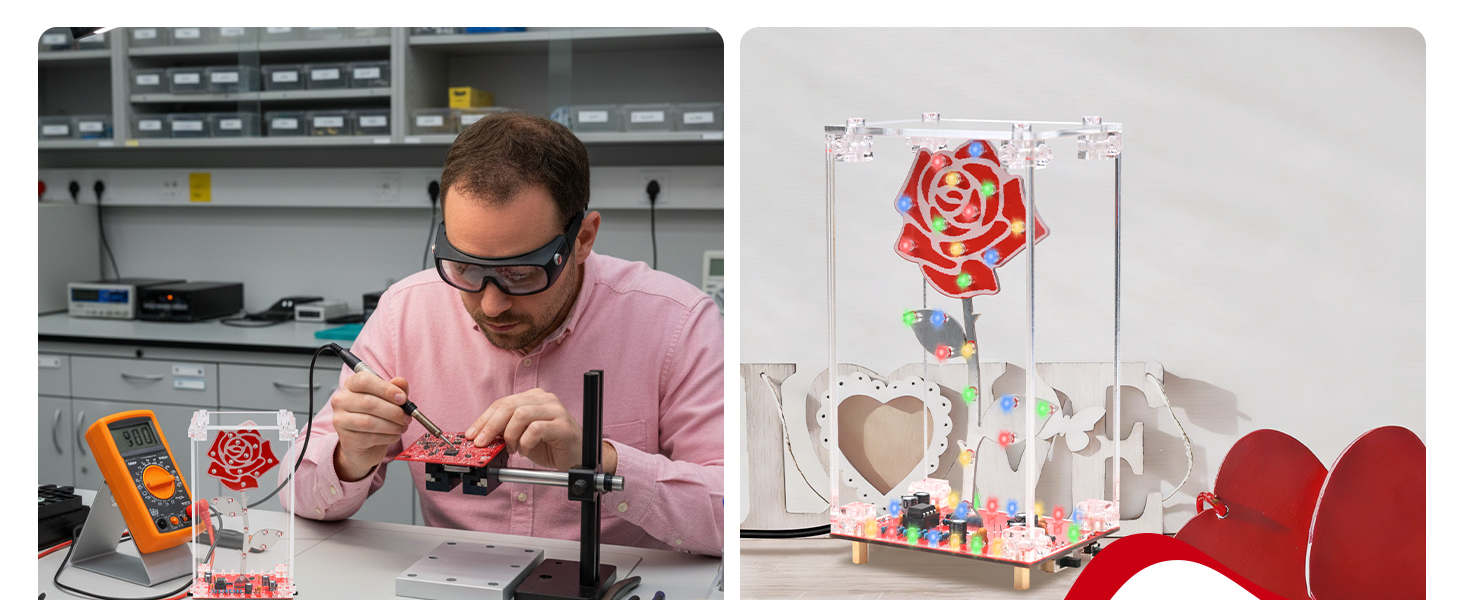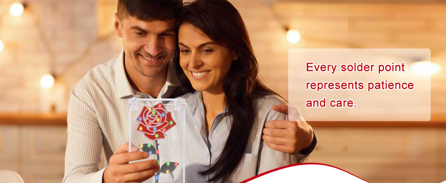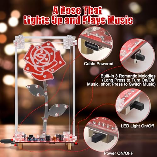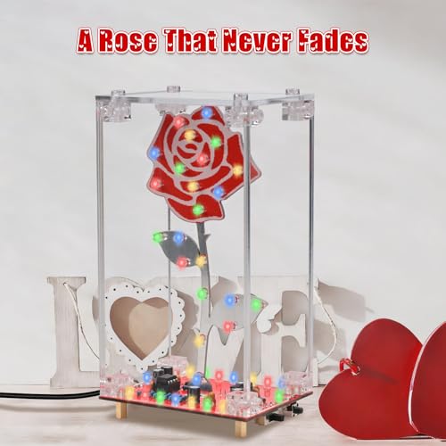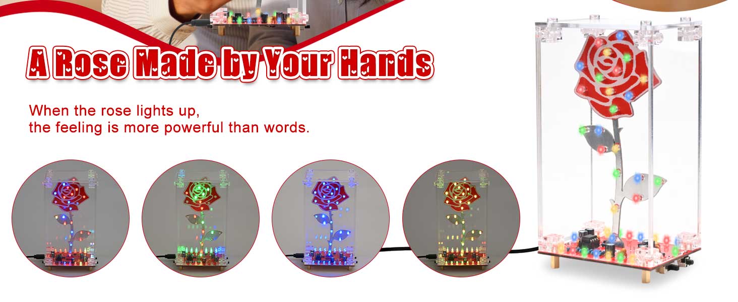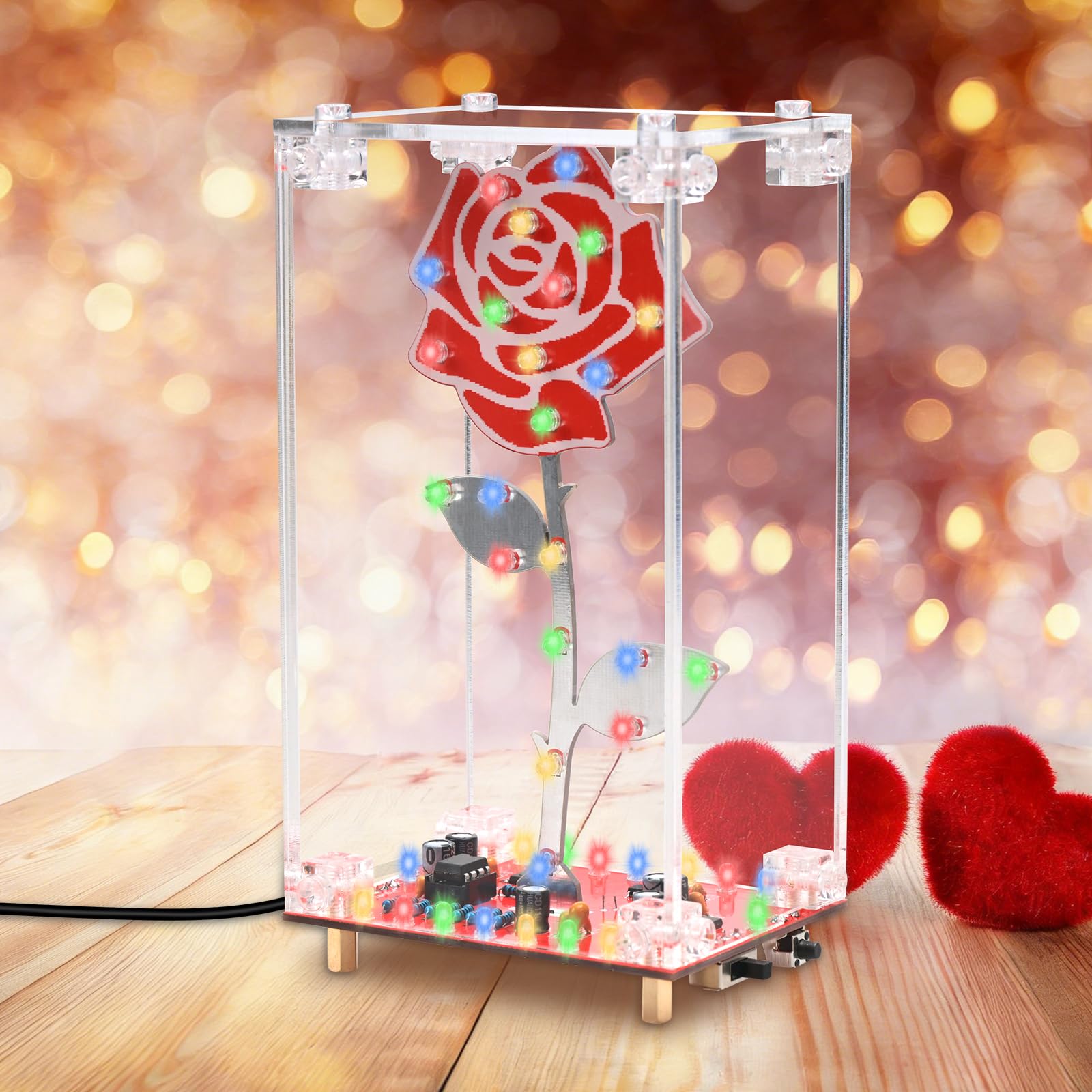 【Rose Flower Design for Present Display】This DIY soldering kit features a rose-shaped LED design with a transparent acrylic case. After assembly, the colorful flashing lights create a decorative display suitable for Valentine's Day, anniversaries, or everyday home décor.