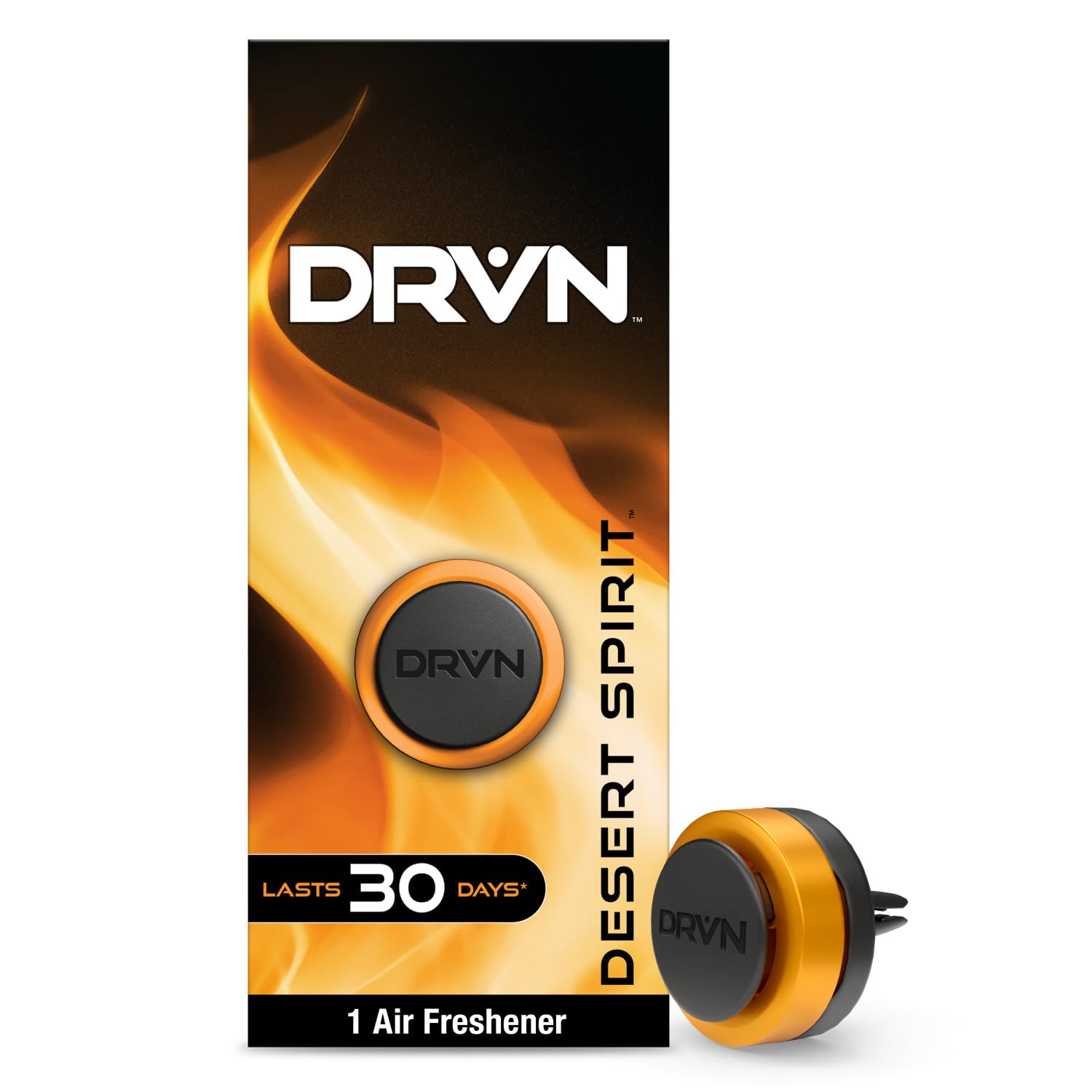 - Car Vent Clips: Six DRVN Vent Clip Car Air Fresheners in Desert Spirit scent, featuring a sleek, circular design and a secure clip that attaches easily to any car vent.
