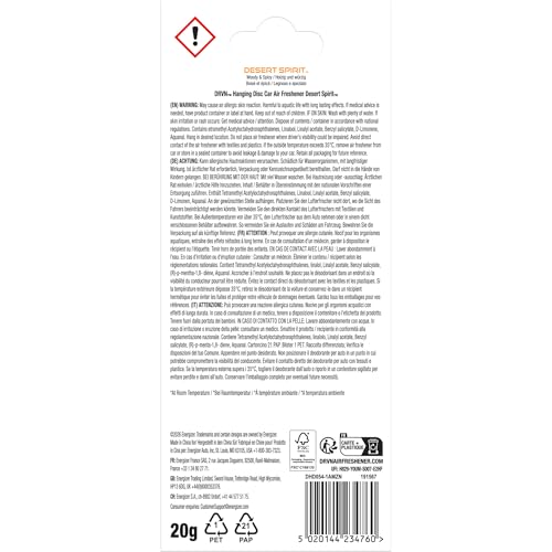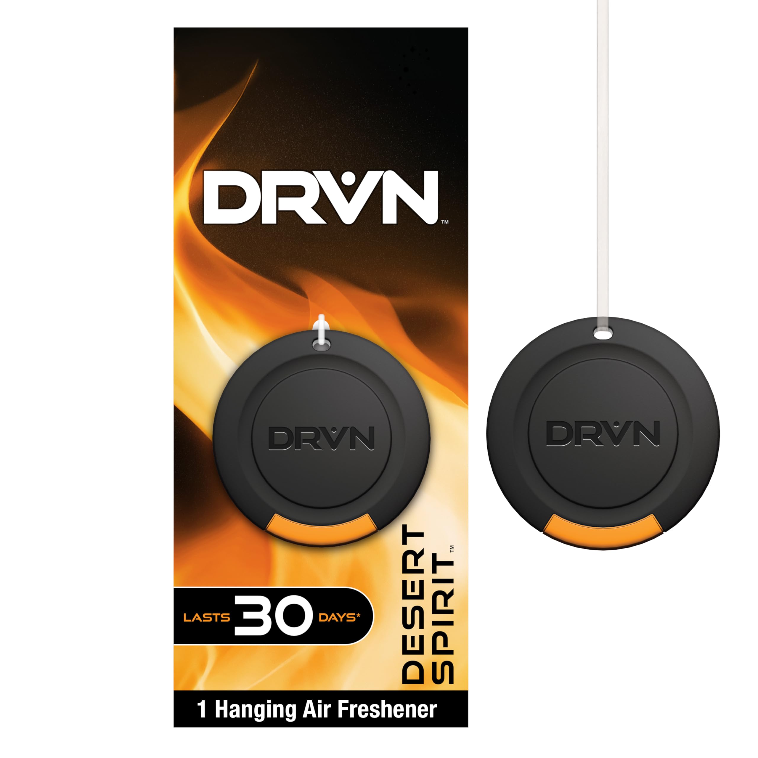 Keep your ride fresh with the DRVN Hanging Disc Car Air Freshener. Designed to hang effortlessly from your rear-view mirror, this sleek fragrance disc delivers a bold Desert Spirit scent with citrus and spice notes to elevate every drive. The universal clear hanger ensures attention stays on the stylish disc, while the securely sealed design guarantees protected freshness. Each disc is perfectly infused for a slower, long-lasting scent release, providing up to 30 days of fragrance under ambient conditions. Whether you’re commuting to work or hitting the open road, the DRVN Hanging Disc combines modern style with reliable freshness for a ride that smells as good as it looks.*Up to 30 days under ambient conditions