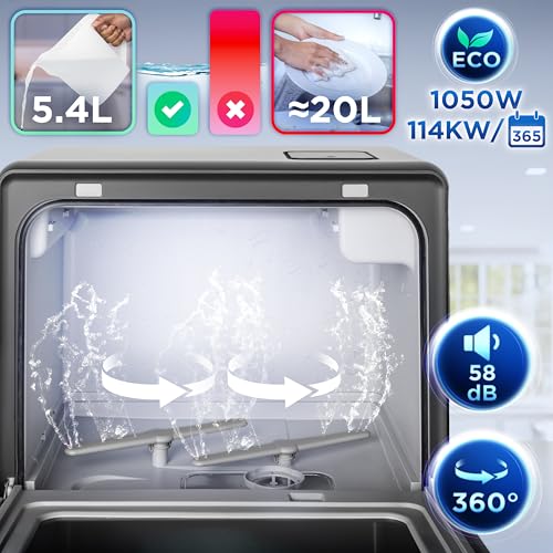 QUIET, EFFICIENT CLEANING ⚡ – This mini dishwasher features multiple spray arms, heated drying and five versatile wash cycles: Normal, ECO, Intensive, Quick and Fruit Wash to deliver sparkling clean results. The fruit wash feature helps to gently clean fruits and vegetables without damaging them. This table top dishwasher’s quiet operation ensures a peaceful kitchen environment even during use.