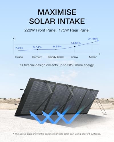220W Bifacial Solar Panel for Higher Efficiency: With the portable solar panel industry's first use of N-TYPE solar technology, we've raised the bar with a 25% conversion efficiency rate. It provides a higher charging speed with a smaller size. With its dual-sided design, capture up to 28% more energy, perfect for camping and other outdoor activities.