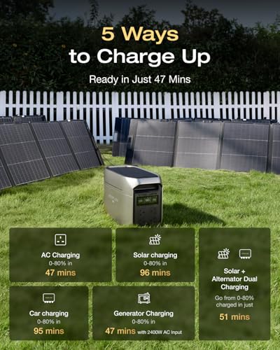 Up to 1000W Solar Input for Fast Recharging: Go off-grid confidently with lightning-fast solar charging. Pair the DELTA 3 Max Plus with EcoFlow 220W High-Efficiency Solar Panels to reach 0–80% in just 96 minutes. Perfect for campers, RV travelers, and homeowners seeking clean, renewable backup power anywhere.