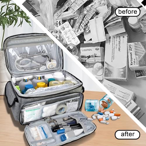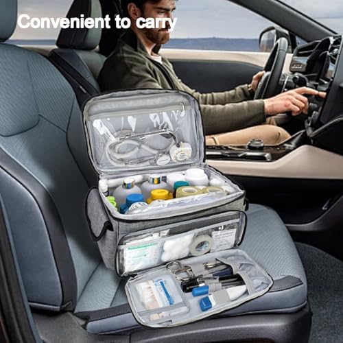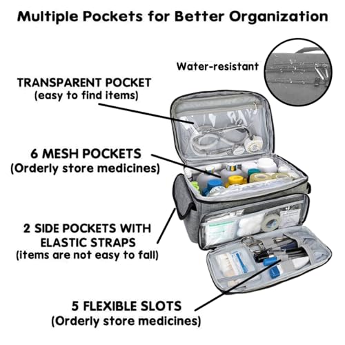 Spacious & Organized: With its multi-pocket design, 6 mesh pockets, 2 side pockets with elastic straps, 5 flexible slots, and 1 transparent pocket, this first aid bag provides ample space to neatly organize all your first aid supplies, from bandages to medicines, ensuring quick access in emergencies.