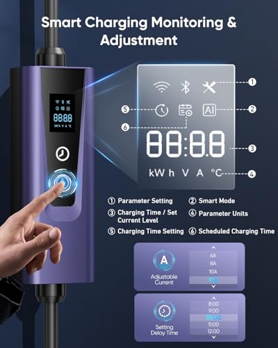 【Smart Adjustability & Real-Time Monitoring】Precisely select amperage (6A–13A) and set charging duration (0–12 hours) to save energy and reduce grid load. The 2.4″ digital screen clearly shows status, temperature, time, and errors for user-friendly operation.