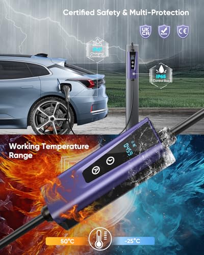 【Certified Safety & Multi-Protection】CE, UKCA, ROHS, TUV, and BS certified. Features multi-layer protection against overheating, leakage, over-current, over/under-voltage, and auto-shutoff when fully charged. Rated IP67 (connector) and IP65 (control box), operating from -25°C to 55°C.