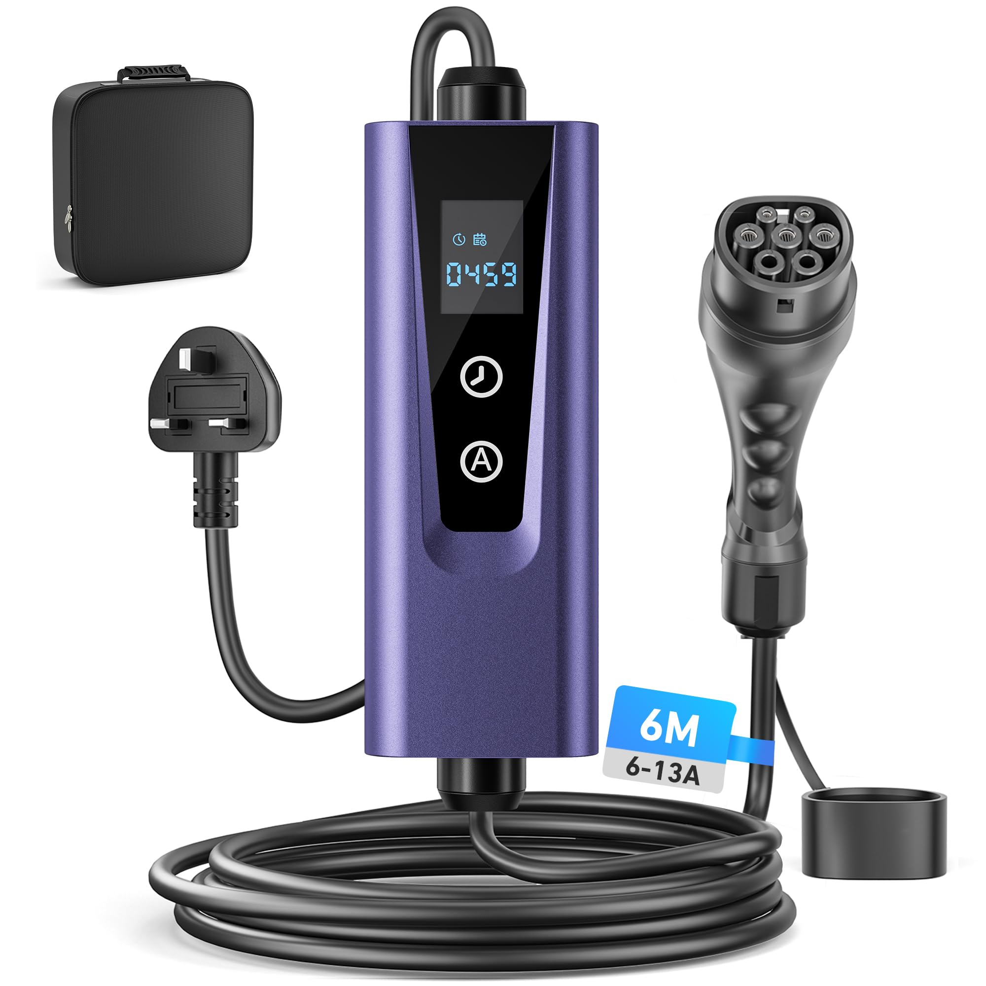 【6M EV Charger Charging Performance】Delivers up to 3.1 kW maximum power with adjustable current from 6A to 13A, enabling charging speeds of 8–16 miles per hour—approximately 1.3x faster than standard 10A home chargers. Compatible with 110V–250V outlets, offering reliable charging at home or outdoors.For safe sustained charging, a BS 1363/EV socket is recommended. If using a standard BS 1363 socket, please set to 10A.Please fully uncoil the cable to prevent overheating.