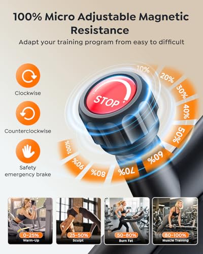 【Adjustable Resistance, Multiple Riding Modes】Burever exercise bike for home gyms offers 0-100% adjustable resistance, giving you a wide range of training intensity options. Whether you're a fitness enthusiast or a beginner, this cycling machine can meet all your needs, providing multiple modes including warm-up, seated riding, standing riding, and seated riding with dumbbells. An emergency brake instantly stops the flywheel, ensuring a safer ride.