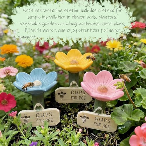 - Easy Placement Bee Cups for Garden Use: Each bee watering station includes a stake for simple installation in flower beds, planters, vegetable gardens or along pathways. Just place, fill with water, and enjoy effortless pollinator support.