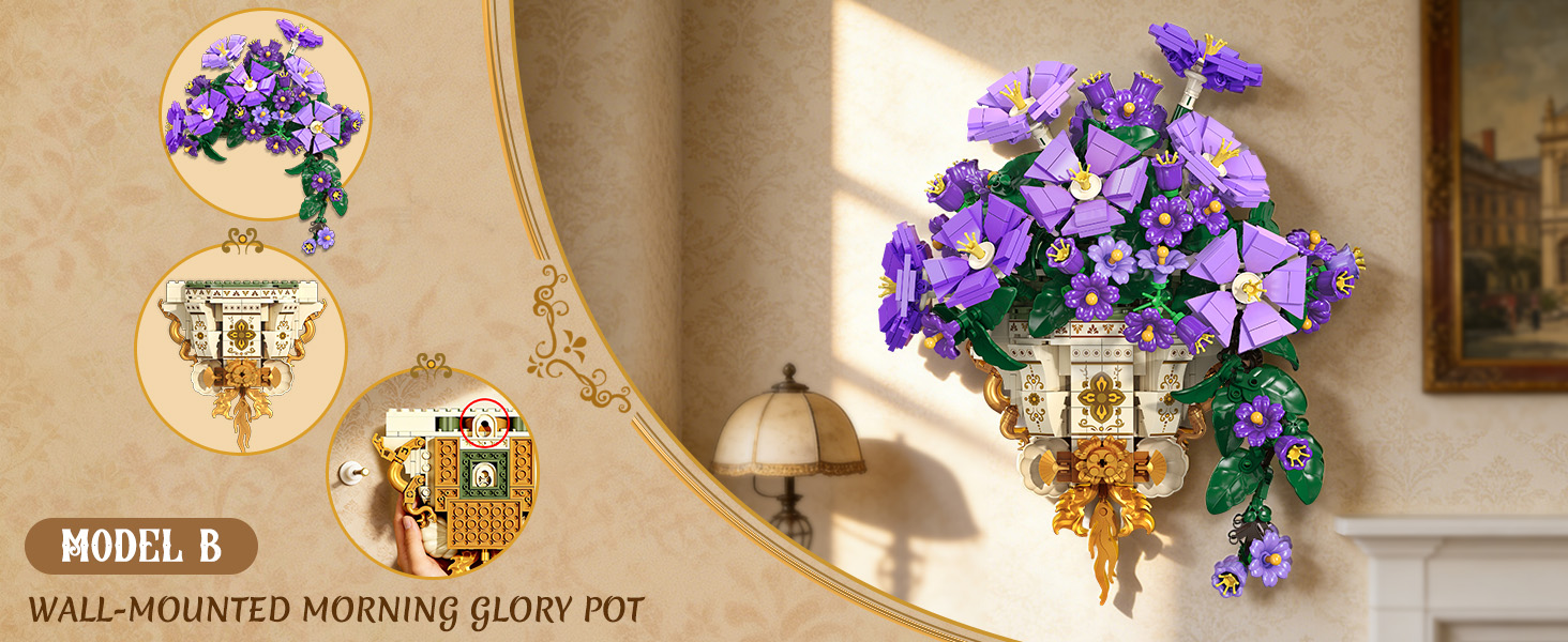 - FROM TABLETOP TO WALL ART – Blending nature’s elegance with architectural creativity. This 2-in-1 flower building kit transforms from a lifelike potted morning glory to a vintage wall decoration flower pot, celebrating the duality of indoor greenery. Start with a lovely plant bonsai, then reimagine it as a Morning Glory wall-mounted flower pot. Dual styling options mean double the decorative impact.(Friendly reminder: It is recommended to use it with thin nails when hanging.)