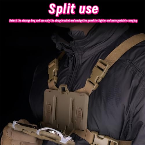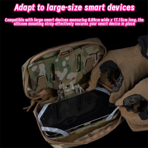 It fits large smart devices (8.89cm width ×17.15cm length), with silicone straps to keep devices stable. The front two sides can be opened for quick access. You can fix the bag via zipper or adhesive panel. For lighter carry, detach the storage bag and use just the strap bracket and navigation board. Also, the navigation board can mount all kinds of tactical gears with “M”.