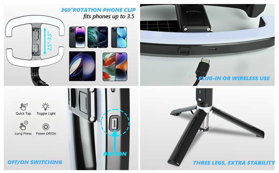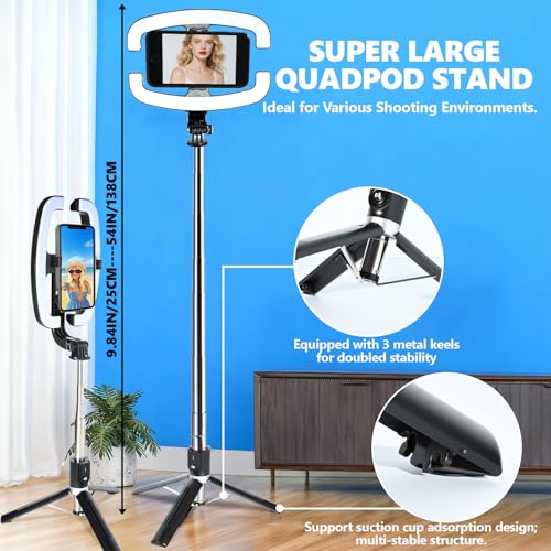 - 【Stable and Durable 4-legs Tripod 】The ring lights Tripod's premium stainless steel telescopic rod delivers lasting durability and a comfortable grip for steady shots The tripod of this phone tripod with light has small suction cups at the bottom, making it more stable when placed. This effectively prevents shaking during shooting and ensures clear and stable images, providing you with a more professional shooting effect