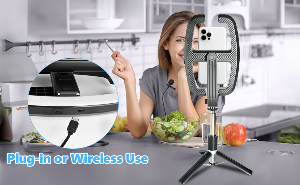 Desktop phone holder with ring light, rechargeable plug-in or wireless use of led light