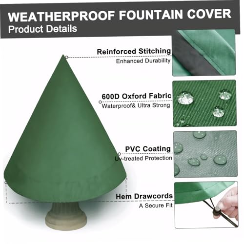 Description: Protect your outdoor fountains and garden statues with our Fountain Cover! Measuring 48 x 61 inches, this cover is crafted from stable, waterproof materials that shield your garden accents from harsh winter weather, including rain, snow, and ice. Its unique tree shape design adds an appealing aesthetic touch to your garden when not in use. Featuring an elastic hem and a locking drawcord, it provides a secure fit to prevent it from being blown away during windy conditions. Keep your outdoor investments safe and looking great through the seasons with our reliable all-weather Fountain Coveryour ideal protective garden accessory! Features:. Fountain Cover. -Color: Dark Green. -Material: 600D Waterproof Oxford Cloth. -Size: about 48 x 61inch.