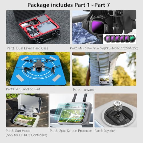 7-in-1 Combo Kit: Specifically designed for the DJI Mini 5 Pro, perfectly matching the dimensions and ease of use of original accessories. The kit includes a Mini 5 Pro double-layer hard-shell protective case, RC 2 sun visor, RC 2 leather lanyard, two RC 2 tempered glass screen protectors, landing pad,6-piece filter set (CPL + ND8/ND16/ND32/ND64/ND256) and a pair of joysticks