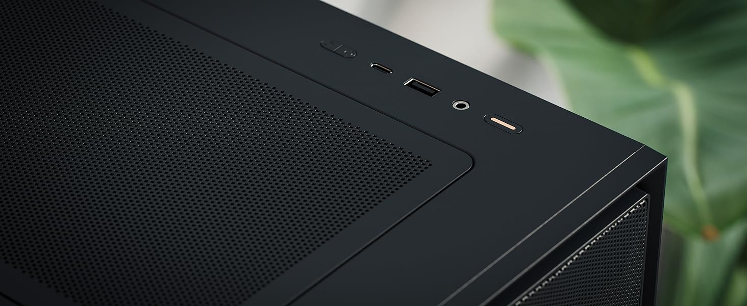 Easily accessible front I/O featuring two USB ports and a combo audio jack.