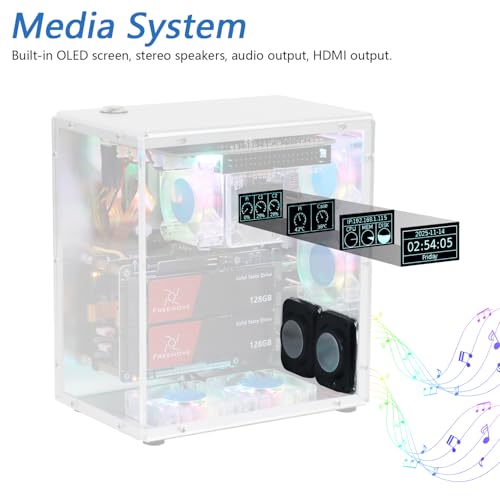 - Media System: Built-in 0.96 inch OLED screen (128 x 64 pixel, single-color) displaying various system status information, stereo speakers, 3.5 mm audio output, dual standard HDMI outputs