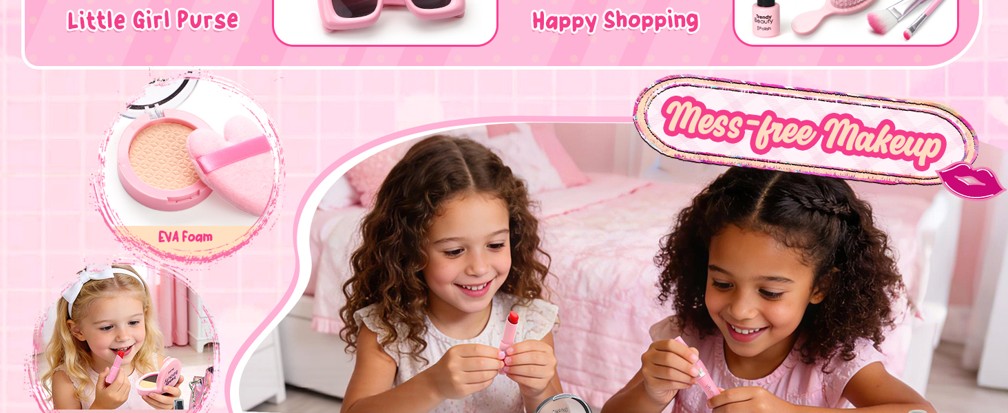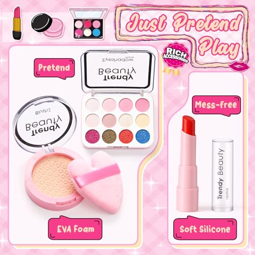 【Realistic Pretend Makeup Set】: Our pretend cosmetic set contains no chemical powders or liquids. Little ones will adore using this makeup toy to pretend to get ready, just like Mom in the morning, using the powder brush or applying lipstick. It looks realistic but won't make a mess or stain hands and skin!