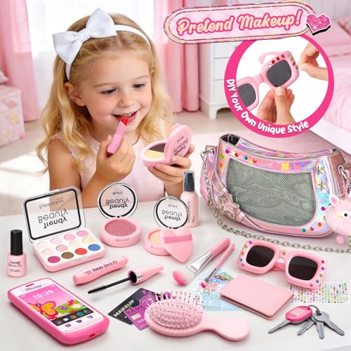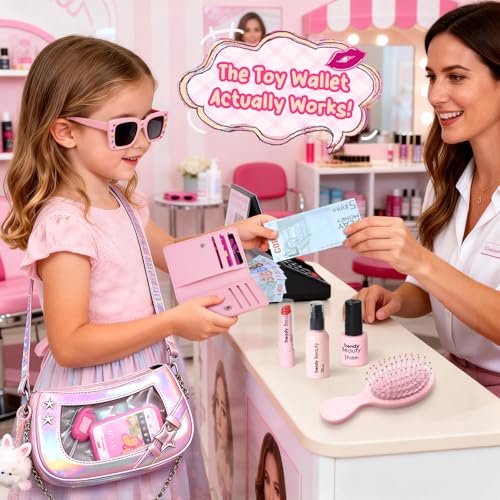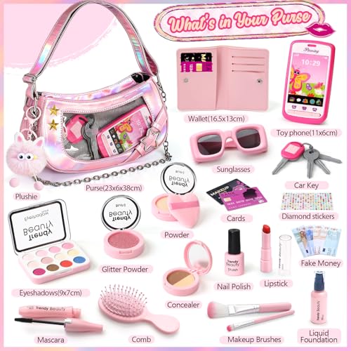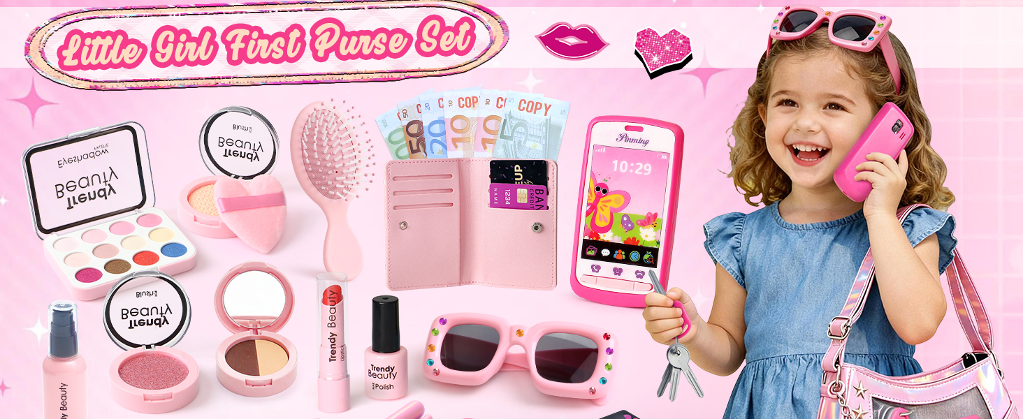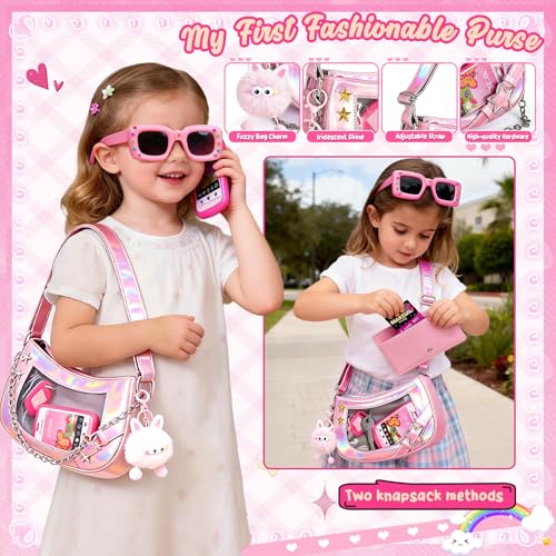 【Little Girls First Purse Set】: This set includes 1dazzling crossbody bag, 1 purse, 10 toy banknotes, 2 toy cards, 1 toy phone, 1 set of pretend keys, a plush keychain, 1 comb, 1 pair of sunglasses, 1 diamond sticker sheet, and a set of realistic pretend play cosmetics. Perfect for children aged 3 and up, it sparks their imagination for endless role-playing.