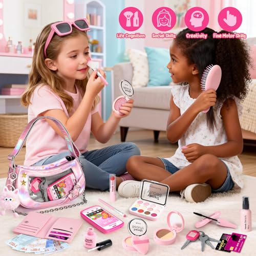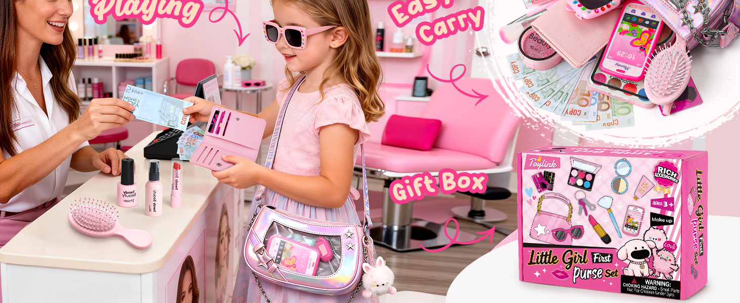 【Learning Through Play】: This kids' handbag set inspires imagination and creativity through role-play while nurturing important life skills: practicing "shopping" with the purse and toy money helps learn money concepts and enhances social interaction. Pretend makeup and organizing the bag also help develop fine motor skills, satisfying children's natural curiosity and desire to imitate!