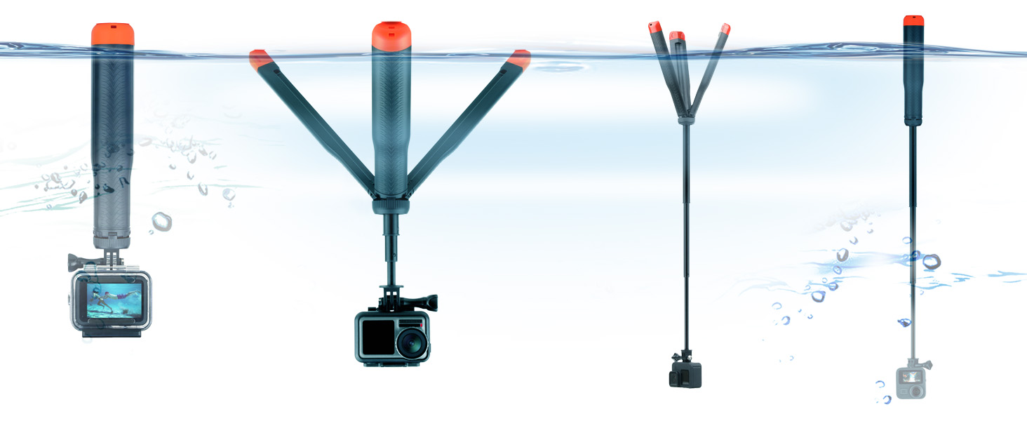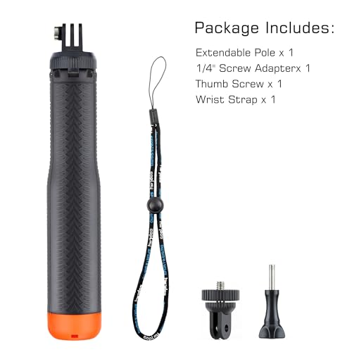 - GoPro Floating Accessories in the water – It can be used as a extendable floating pole or a telescopic floating tripod in the water. You can capture underwater movements without holding the grip. The high visibility orange red cap piece is easy to spot and retrieve in the water