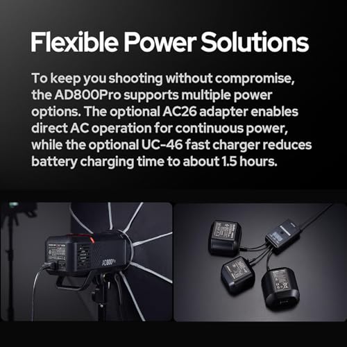 - Flexible Power Solutions: To keep you shooting without compromise, the AD800Pro supports multiple power options. The optional AC26 adapter enables direct AC operation for continuous power, while the optional UC-46 fast charger reduces battery charging time to about 1.5 hours