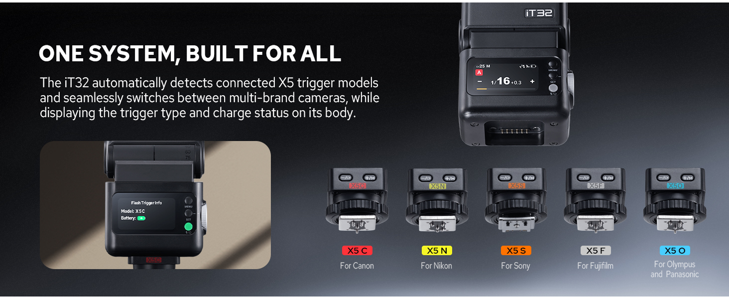 - Cross-Brand Compatibility via Interchangeable Magnetic X5 Hotshoes: The iT32 + X5 system is also Compatible with Canon/Nikon/Sony/Fujifilm/Olympus/Panasonic/Leica via corresponding X5 versions (C/N/S/F/O/L) (Sold Separately). This universal design eliminates gear clutter and extra costs, enabling full TTL & HSS (High-Speed Sync up to 1/8000s on select cameras) compatibility across brands so that you can focus on creativity—not compatibility issues