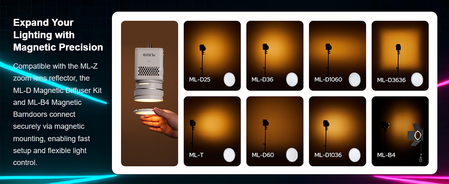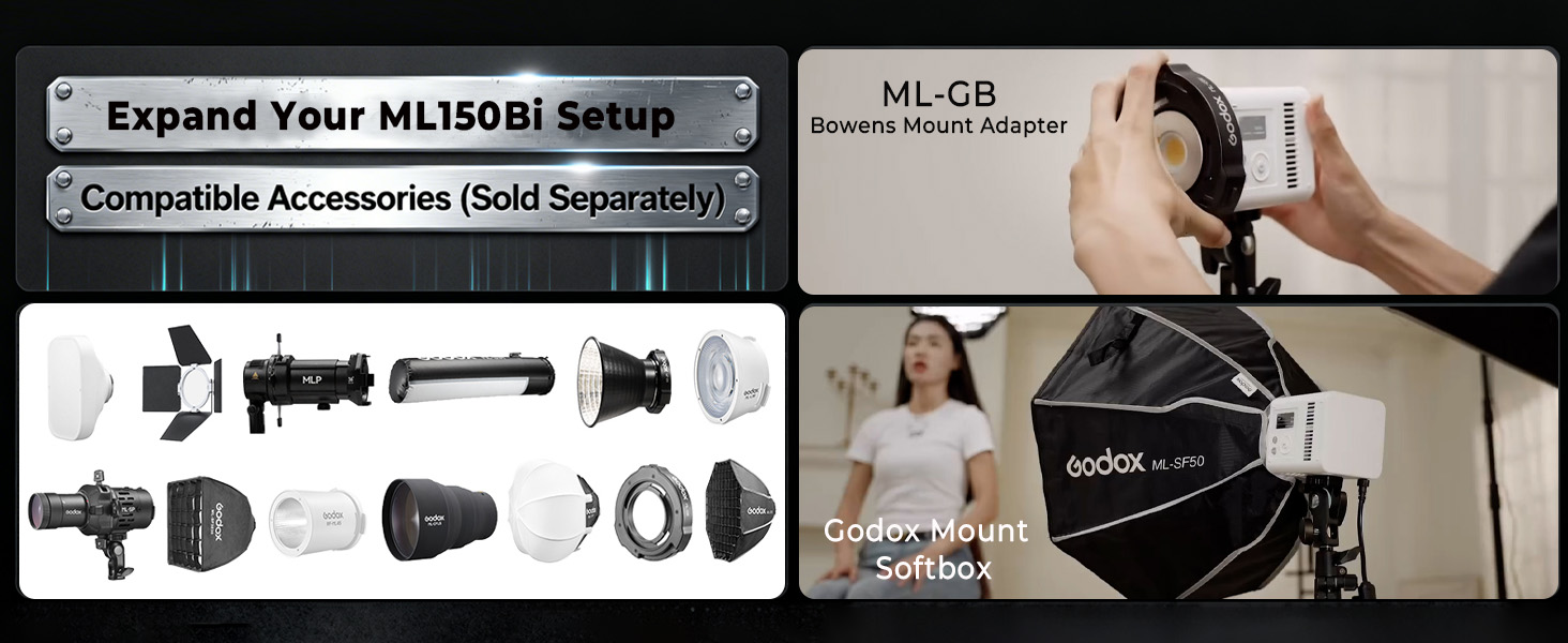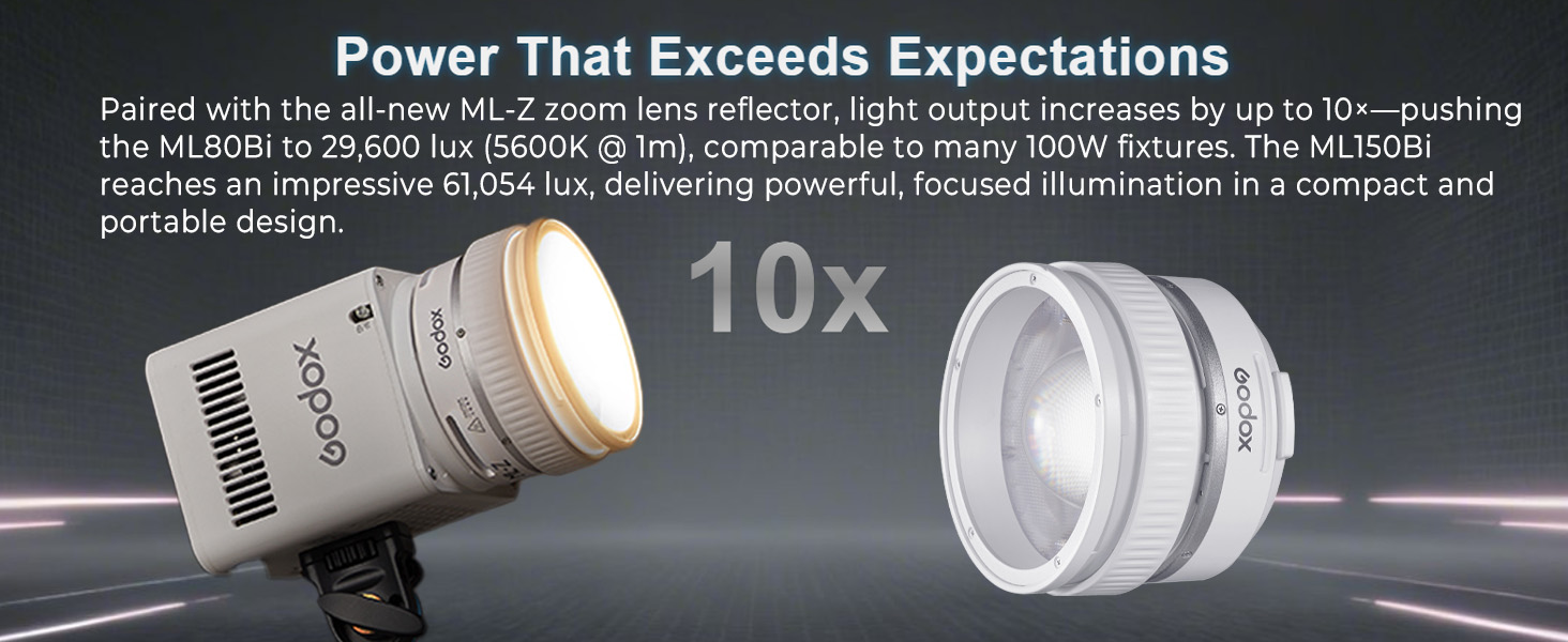 Exceptional Brightness in a Compact Body: The Godox ML150 delivers up to 61,054 lux at 3.3ft (5600K) using the included zoom lens, producing light output comparable to much larger fixtures. Its compact and modular design makes it ideal for studios, interviews, and location shoots.
