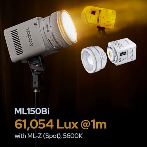 Godox ML150Bi Bi-Color LED Video Light 2800-6500K, 61,054 Lux Compact Modular Light with Zoom Lens, App & Wireless Control, CRI 96 TLCI 96, V-Mount & DC Powered for Photography and Video