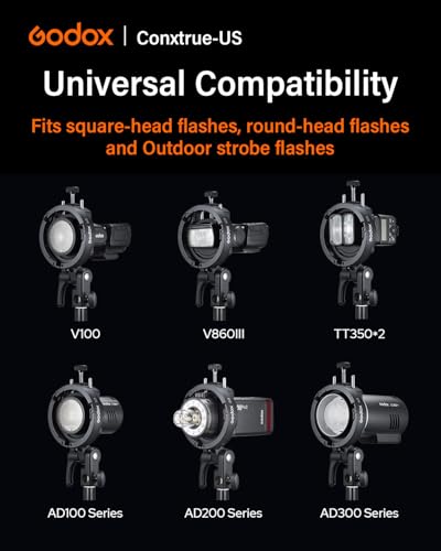- 【Universal Flash Compatibility】Godox S3 Bracket is update 2025 version of S2 type bracket, It fits round-head on-camera flashes, like the V1, V1Pro, V100 series, as well as square-head flashes, including the V850III, V860II, V860III and TT350, TT685II, TT600, TT520III, IT32 series. In addition, it perfectly accommodates outdoor flashes, such as the AD300Pro, AD200ProII, and AD100Pro series, making it the only bracket you need for multiple flash systems.