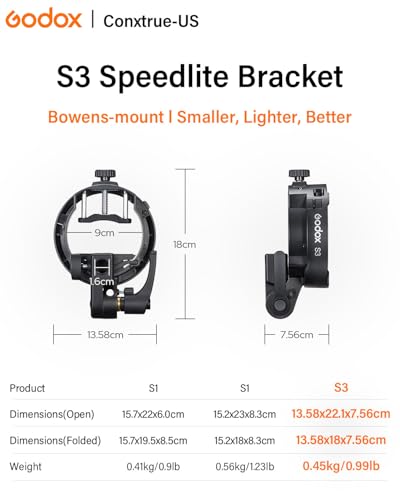 - 【Redesigned to be smaller and lighter】Godox S3 Speedlite Bracket is more portable and convenient to carry than the S1 or S2 Type Bracket. Its integrated, one-piece design eliminates the need for assembly, so it's ready for immediate use.