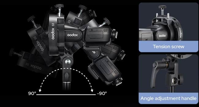 Godox S3 Speedlite Flash Bracket for AD200 Pro II, AD400Pro II, AD300Pro, for Godox V1 Pro, V100 Round Head Flash, V860III / TT685II/ TT350 Series, Tilts ±90° S-Type Bracket Bowens Mount Holde